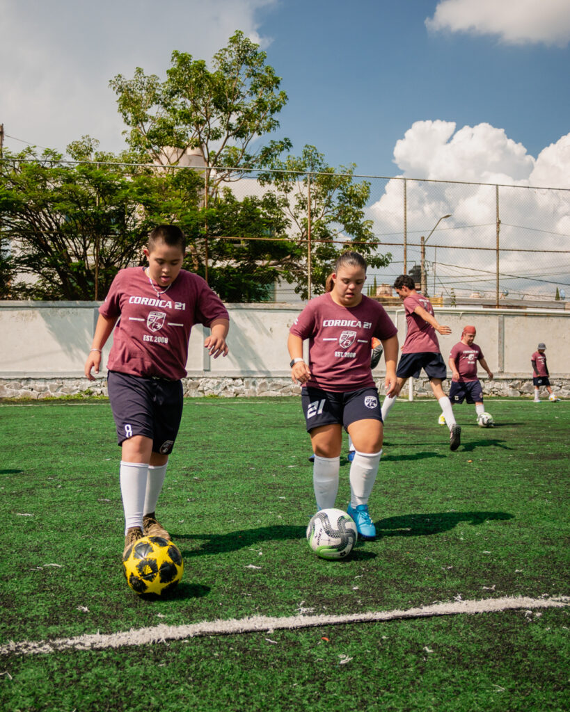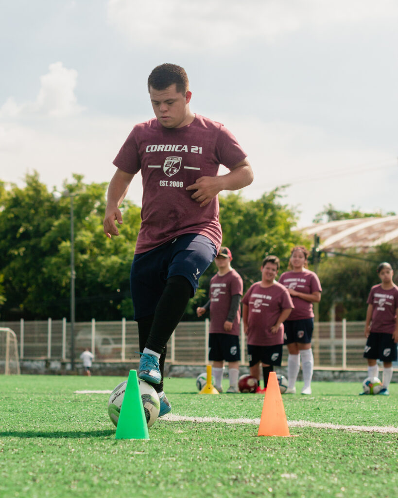 Contamos con una escuela de futbol en la que participan más de 50 jugadores con sindrome de down y discapacidad intelectual.